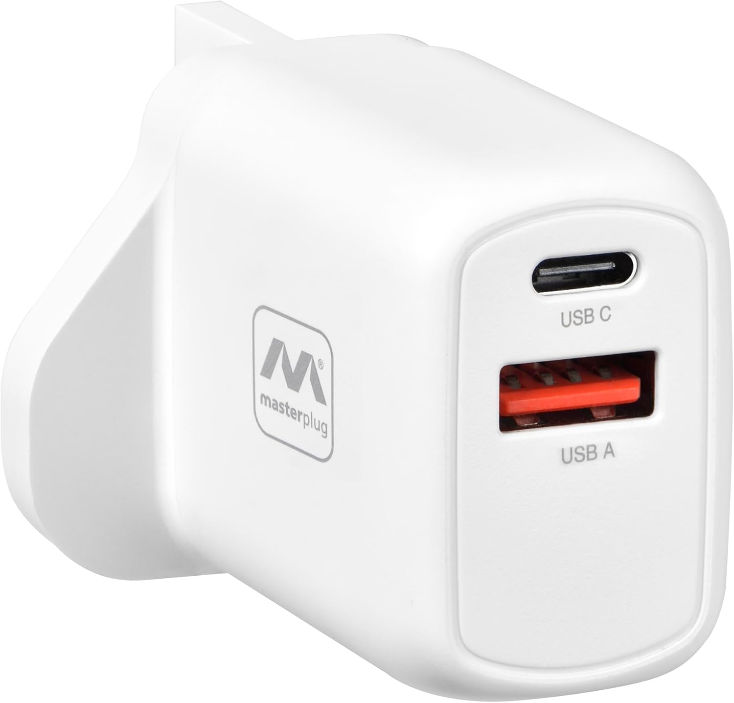 Masterplug Super-Fast USB Charging Plug with USB A and USB C Charging Ports, for Mobiles and Tablets, 30 Watts, White